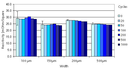 Figure 4 shows data collected in thermal cycling tests between –40 and 85 °C up to 1000 times (x axis) The results show little or no change to resistivity (y axis). Extended periods of time at temperatures at up to 85 °C have shown changes to resistance of tracks due to further curing. These results are taken from work done at Fraunhofer IZM on tracks that have been cured for two minutes at 125 °C.